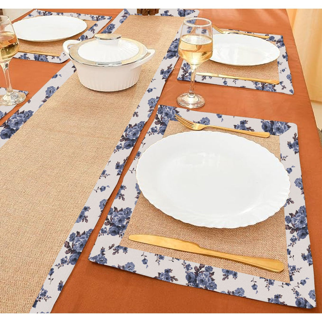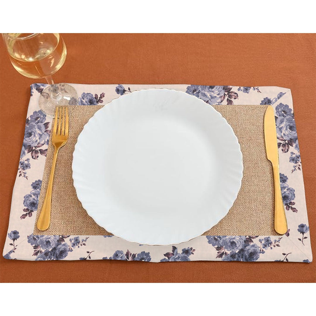 Jute Table Mat Set With border - Rose Garden Blue